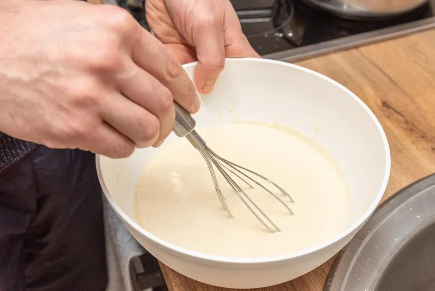 Молоко нужно немного подогреть, смешать с яйцами, растительным маслом, солью и сахаром. Затем не спеша добавьте просеянную муку, перемешивая вилкой или венчиком до получения однородной консистенции без комочков.
