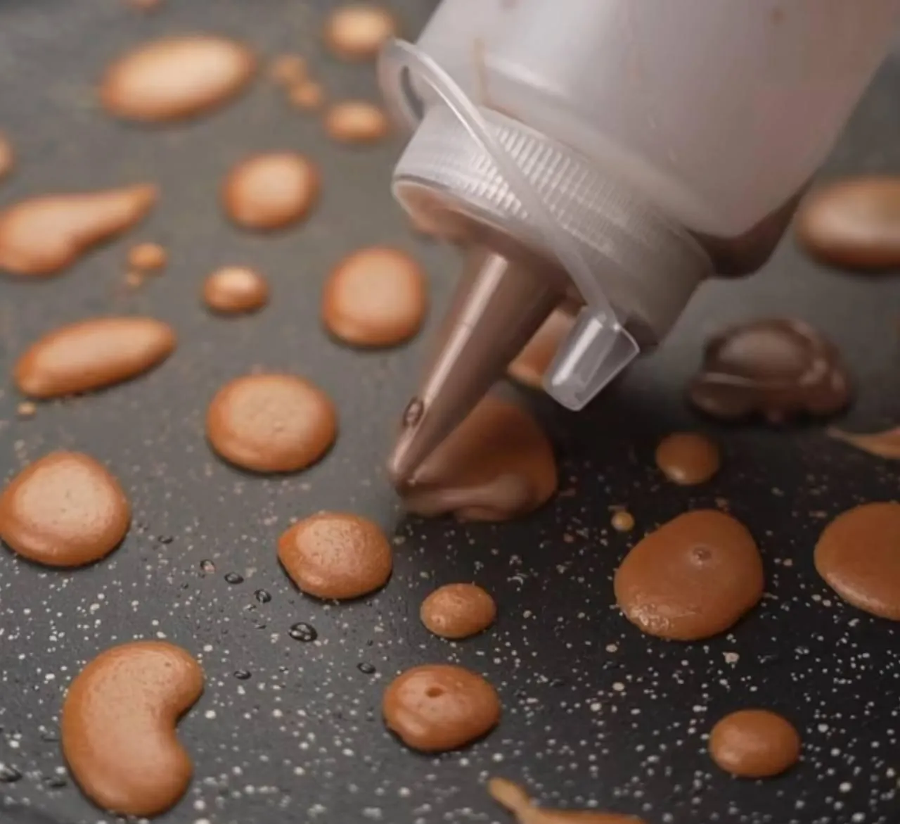 Чтобы «рисовать» на сковороде было удобнее, отлейте часть жидкого теста в пластиковую бутылку (кулинарный рукав или шприц для крема) и уже туда добавьте какао. В крышке бутылки проделайте отверстия, в зависимости от того, какой толщины вы хотите получить узоры на блинчиках. Но при желании можно делать узоры и обычной ложкой, зачерпывая окрашенное тесто из миски.