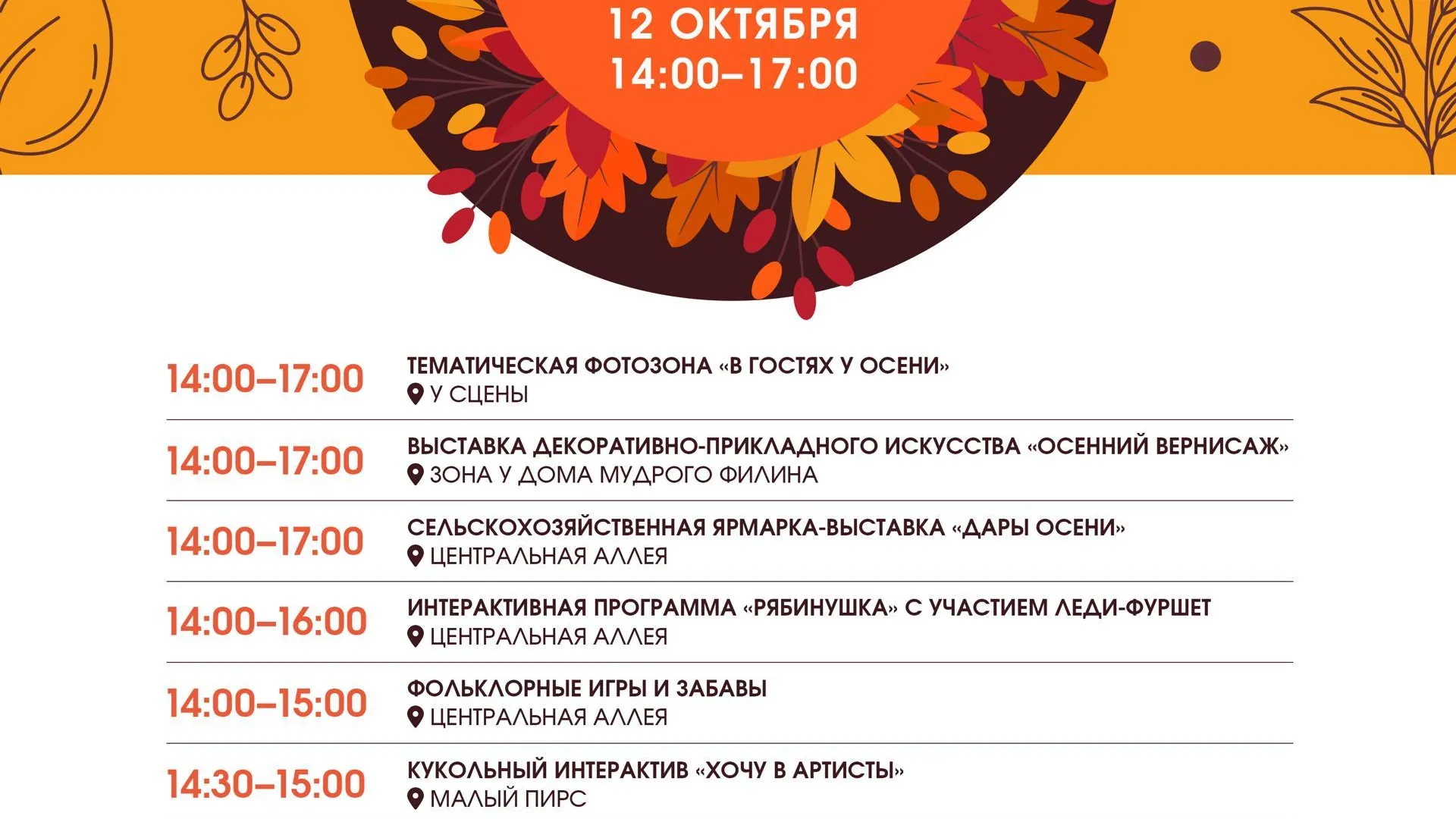 12 октября в Свердловском парке пройдет осенний фестиваль «Праздник осени». Гостей ждут тематическая фотозона, выставка декоративно-прикладного искусства, сельскохозяйственная ярмарка-выставка, интерактивная программа, фольклорные игры и забавы, кукольный интерактив, творческие мастер-классы, чайная станция, танцевальная программа, шоу ходулистов и большой осенний концерт.