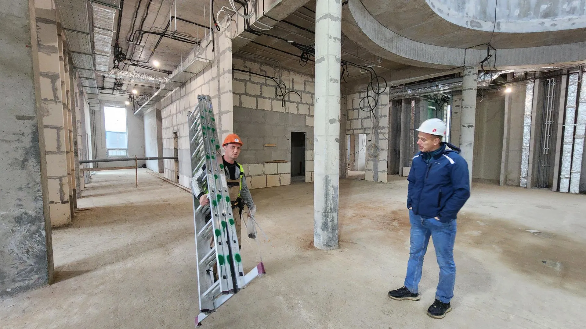 Под потолками устанавливают лотки, короба и кабель‑каналы, прокладывают провода слаботочных сетей, которые обеспечат работу связи, видеонаблюдения, пожаротушения, охранной сигнализации, мультимедиа и систем контроля доступа. В подвале рабочие облицовывают помещения плиткой, устанавливают алюминиевые подоконники. На объекте завершена кирпичная кладка и возведены почти все перегородки. Стены и потолки оштукатурены на 100%, шпаклевка под покраску выполнена на 70%. В здании уже установлено четыре лифта, в ближайшее время начнется их наладка.