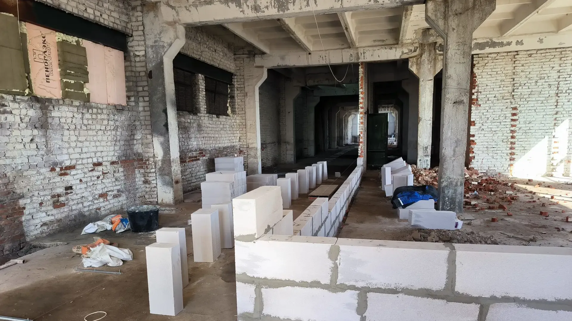 В настоящее время на объекте задействованы более 60 рабочих. Строители полностью завершили демонтаж и приступили к общестроительным и отделочным работам. Параллельно идет ремонт кровли и фасада, а также монтаж инженерных систем.