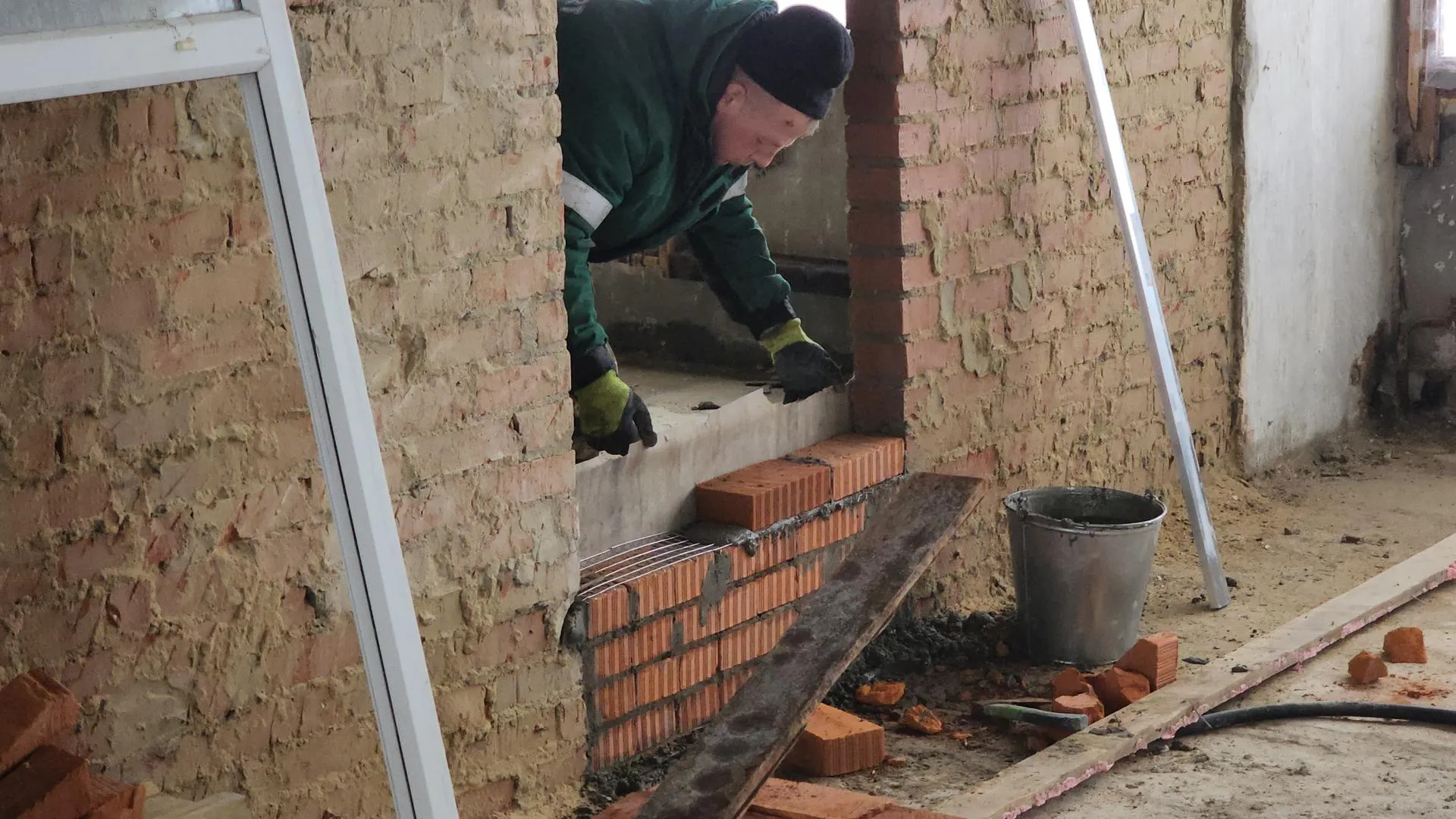 Строители возводят внутренние перегородки в школе № 10 на улице Войкова в Серпухове 24 февраля 2026 года. Работы проводят в рамках капитального ремонта с изменением планировки помещений. Обновленное здание планируют открыть к 1 сентября 2026 года.