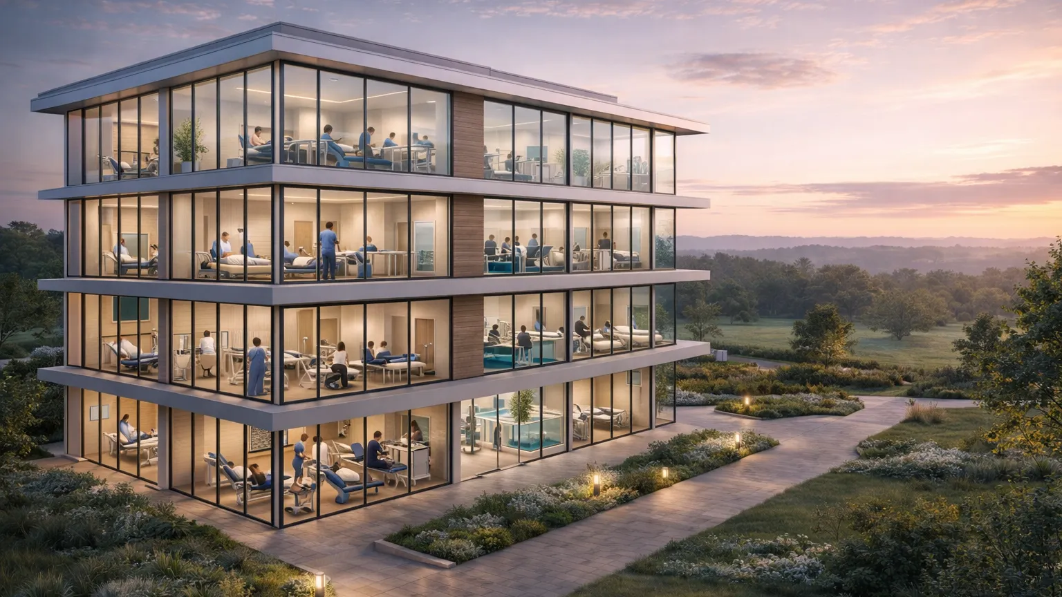 В корпусе оборудуют палаты для пациентов, кабинеты врачей и диагностические помещения, а также инфраструктуру для восстановительного лечения. Планируется создать залы лечебной физкультуры, кабинеты физиотерапии, помещения гидротерапии и массажные кабинеты. Одновременно в здании смогут находиться до 70 человек, включая пациентов и персонал.