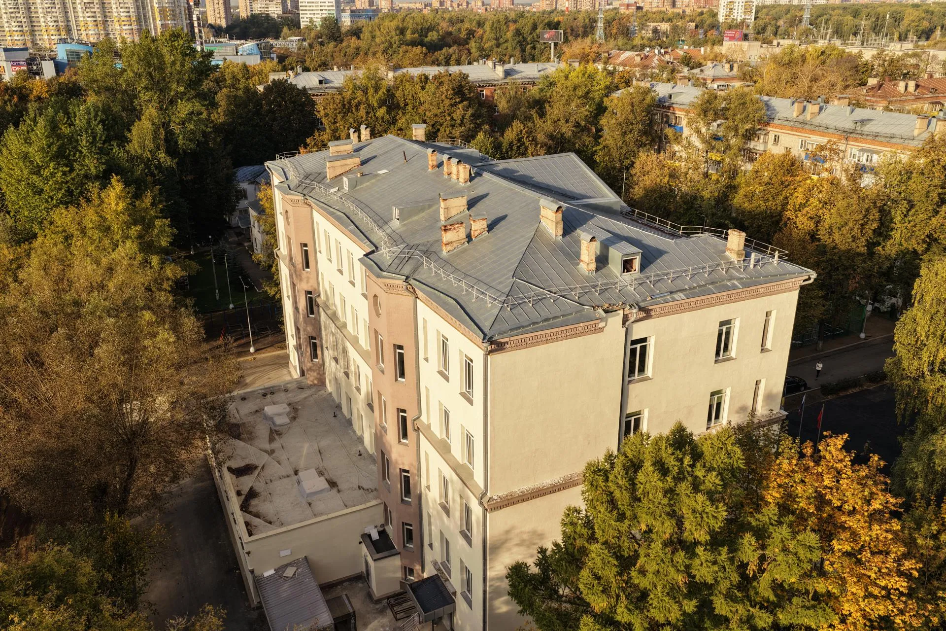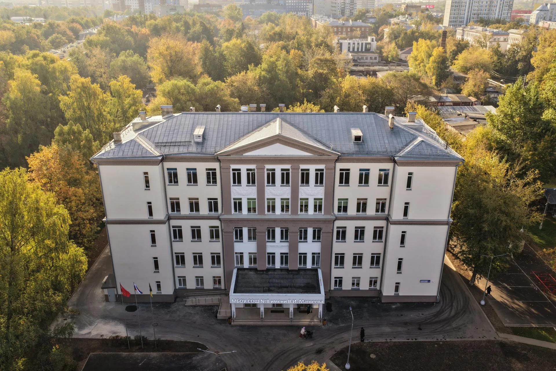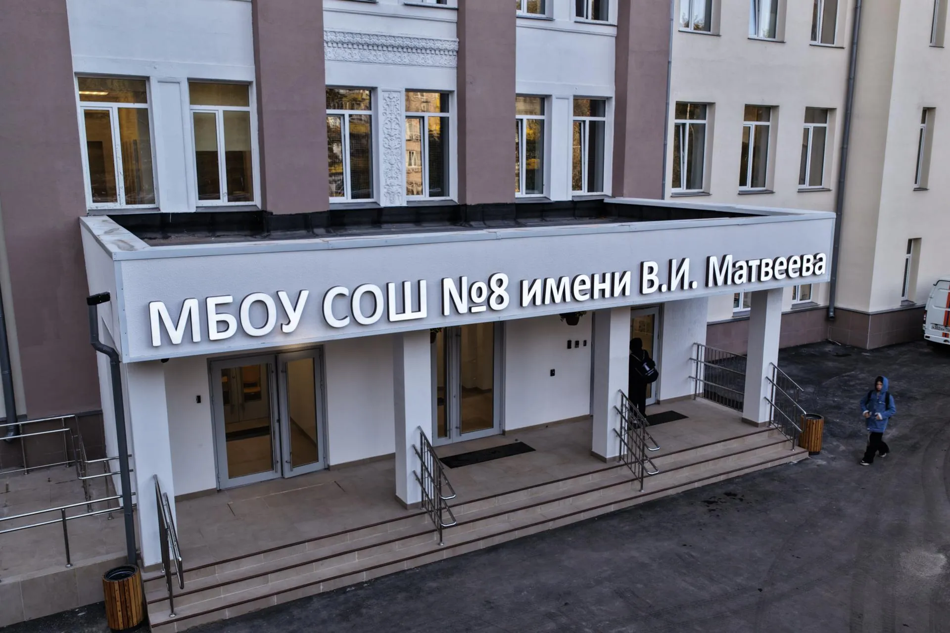 Масштабный капремонт здесь завершили к 1 сентября — обновили библиотеку, кабинеты, столовую, актовый и спортивный залы, заменили кровлю и инженерные сети, сделали перепланировку. Важно, что специалисты сохранили исторический облик здания, в том числе муралы с изображениями ветерана ВОВ Григория Муходавкина и участника СВО Тимофея Воробейкина.