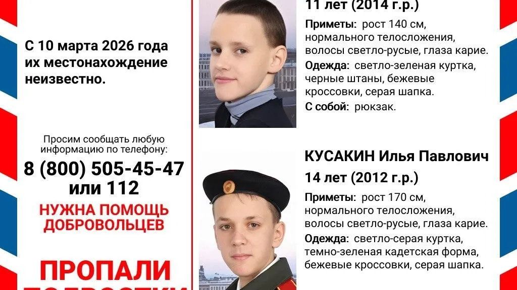 В Санкт-Петербурге исчезли два брата-подростка — Александр и Илья Кусакины. Об этом сообщает «112».