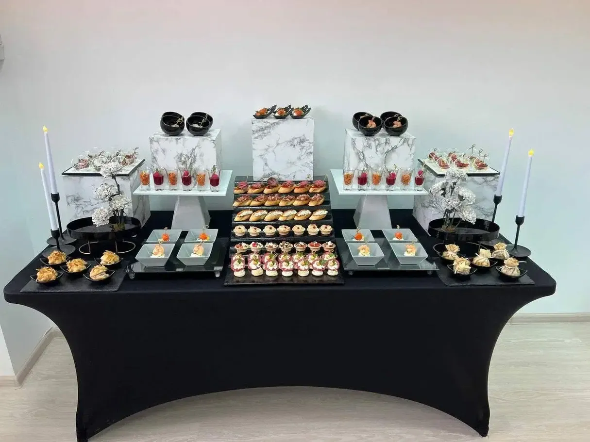 Все элементы должны быть на высшем уровне — от декора до блюд на столе. Поэтому важно заказывать фуршет или банкет заранее — лучше за несколько дней до вашего события.