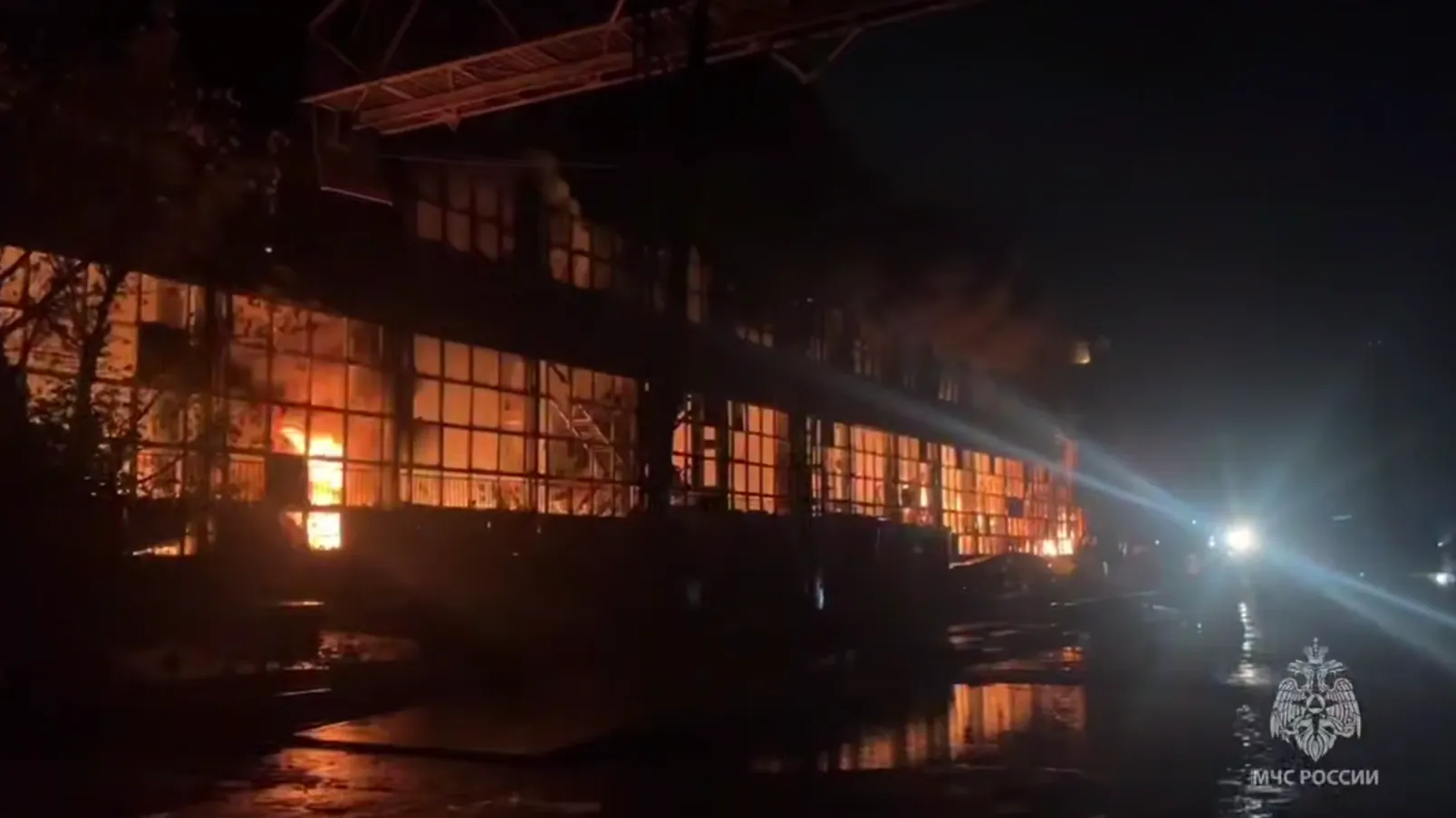 По предварительным данным, внутри здания хранились пластиковые трубы, что создало высокую пожарную нагрузку и способствовало интенсивному распространению огня.