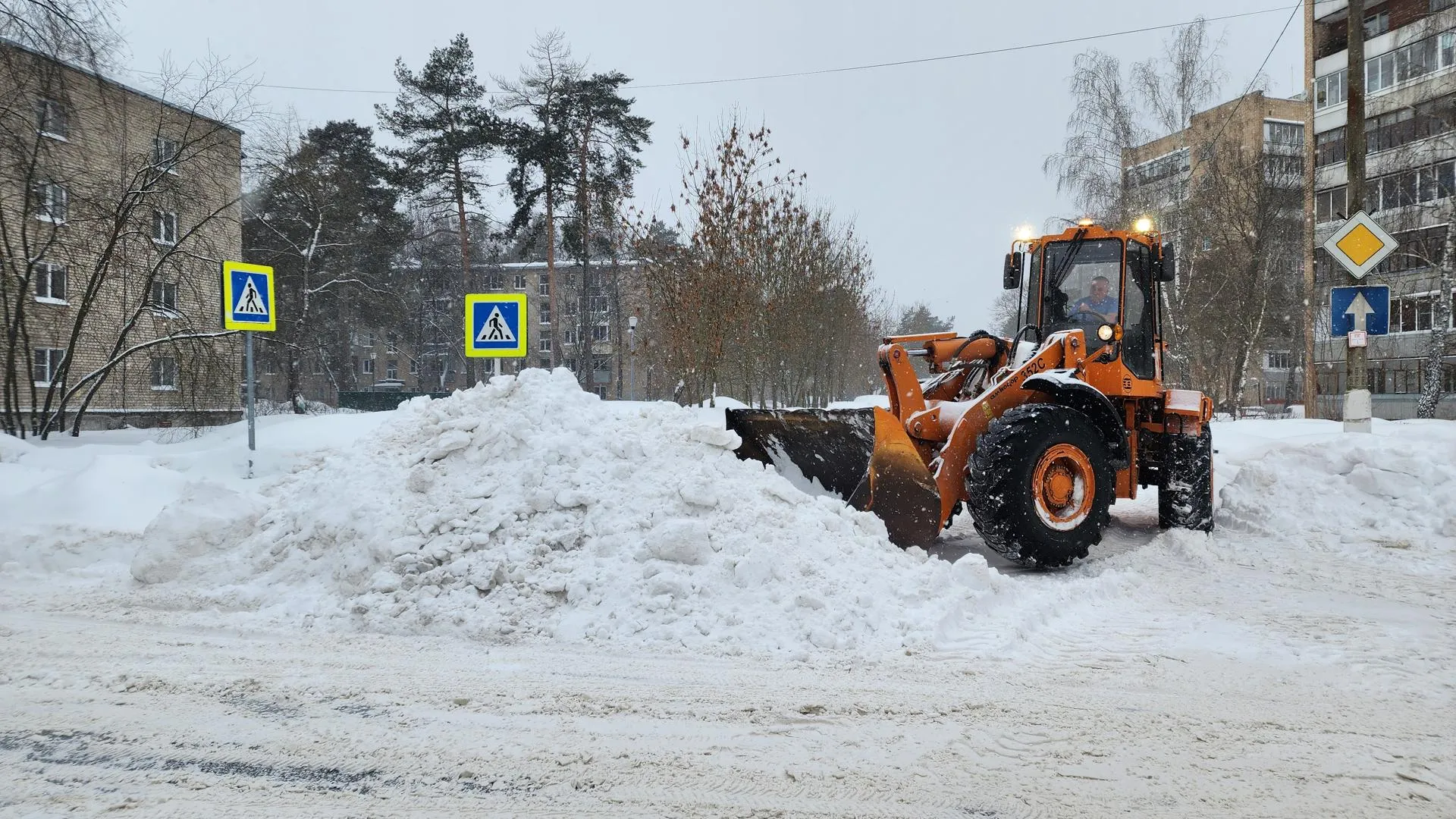Коммунальные службы 19 февраля расчищают сугробы на Т-образном перекрестке улиц Школьной и Московской в Протвине городского округа Серпухов после ночного циклона «Валли».