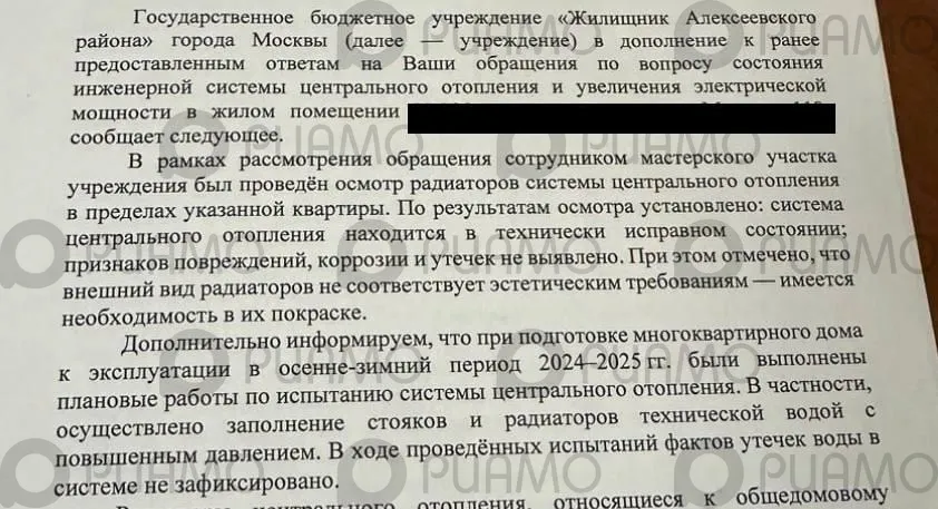 Семья москвичей приобрела квартиру на проспекте Мира (СВАО), но столкнулась с проблемами с радиаторами отопления — они оказались ветхими. С сентября прошлого года жильцы просят ГБУ «Жилищник Алексеевского района» исправить ситуацию с общедомовым имуществом, но получают отказы, игнорирование, а экспертиза и досудебная претензия загадочно теряются несколько раз. Вместо решения проблемы коммунальщики заварили трубу, семья сидит без горячей воды уже 21 день.